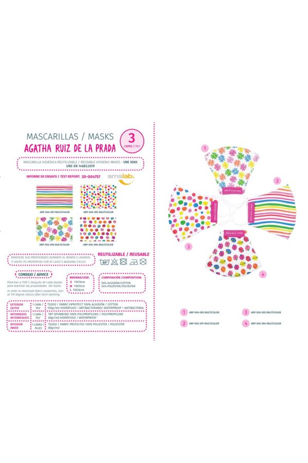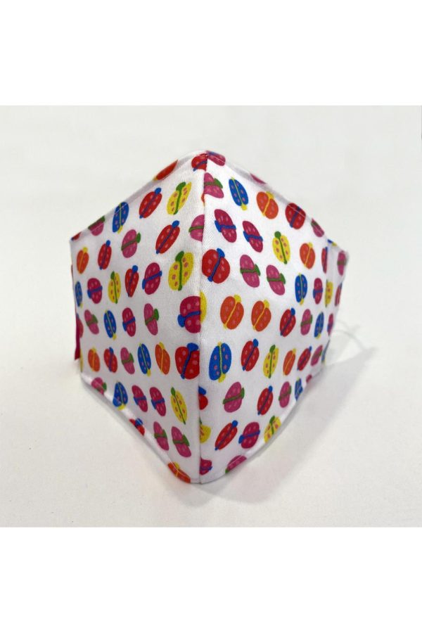 Mascarilla homologadas con estampado mariquitas de colores. EXTERIOR – 1 capa de Tejido Eurosaten 100% algodón con acabado Viprotect ( Antibacteriano e hidrófugo ) – Informe ensayo 20-004757 ( UNE EN 0065 – UNE EN 14683:2019) 5 Lavados