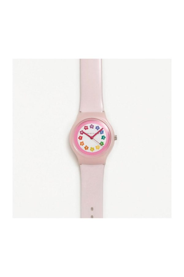 Reloj de pila con correa de goma de color rosa y en la esfera los numeros están sobre estrellas de colores. NO SE PUEDE MOJAR.