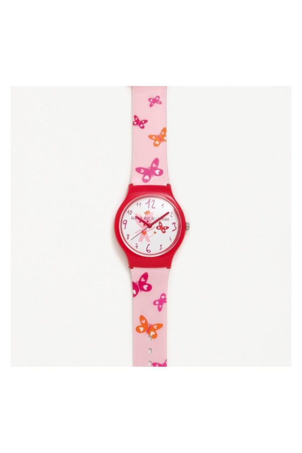 Reloj fantasía rosa con mariposas estampadas. La esfera con números de color fucsia. Reloj grande de pila con correa de PVC. NO SE PUEDE MOJAR.