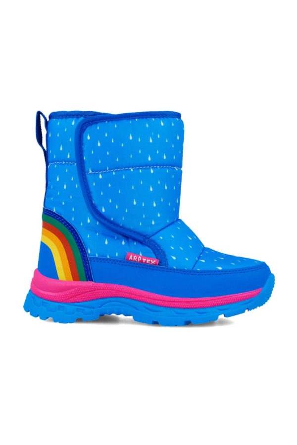 Bota de Apreski de color azul con estampado de arcoiris y gotas blancas, cierre con velcro. Tallaje desde el 24 al 34.