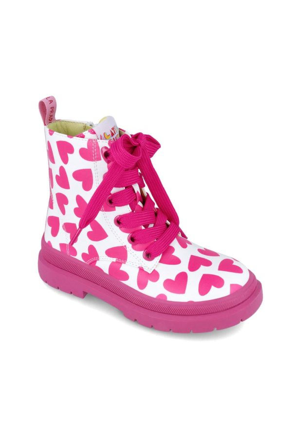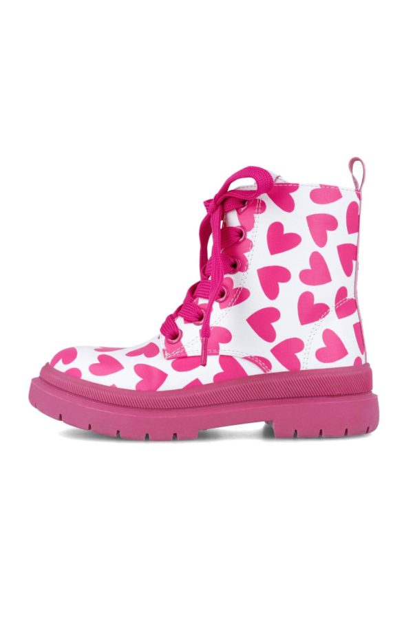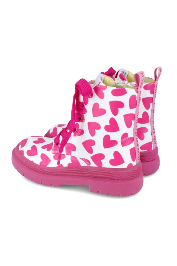 Botín blanco con corazones fucsias y los cordones de color fucsia. Cierre lateral de cremallera. Tallaje desde el 28 al 38.