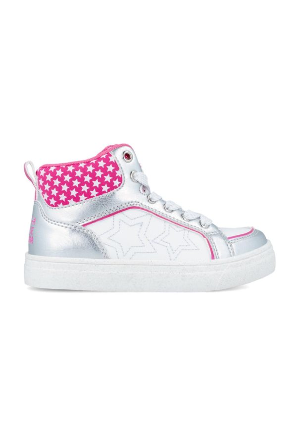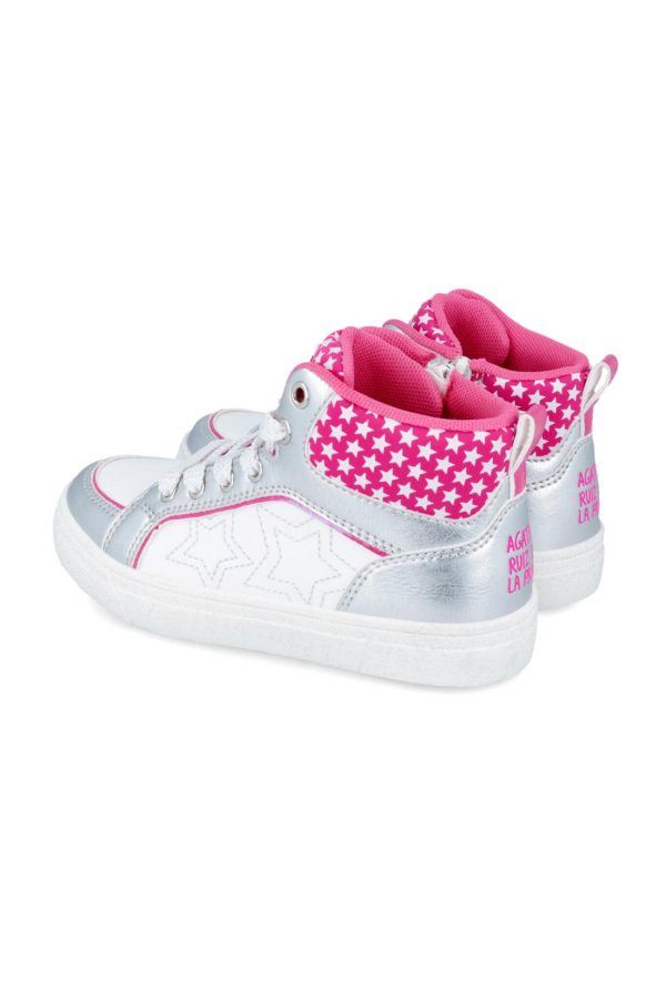 Botín en color blanco y plateado con la parte superior fucsia y estrellas blancas, cordones del miso color. Cierre lateral de cremallera. Tallaje desde el 28 al 36.