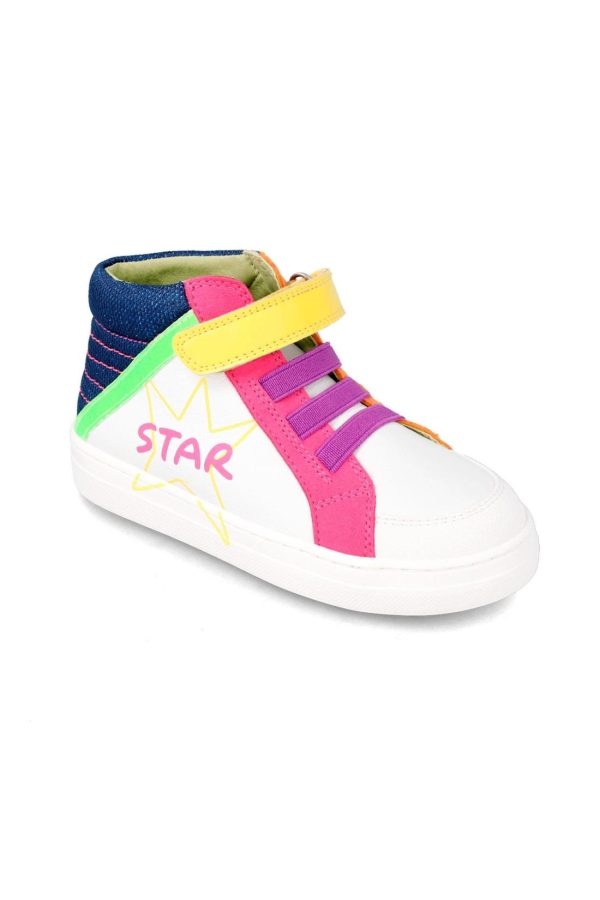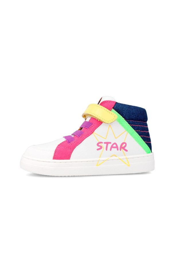 Botín en color blanco con la palabra STAR en fucsia y los cordones de color fucsia. Cierre lateral de cremallera. Tallaje desde el 24 al 36.